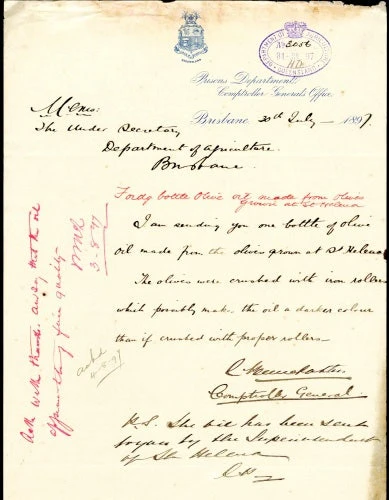 The closest thing to a native olive! The variety has been grown on St Helena Island, Moreton Bay since the 1800s and oil was even exported back to Italy. The images also show a postcard from the Superintendent of St Helena regarding making olive oil; and a letter from the prison governor forwarding a bottle of olive oil (once they cracked the technique!)