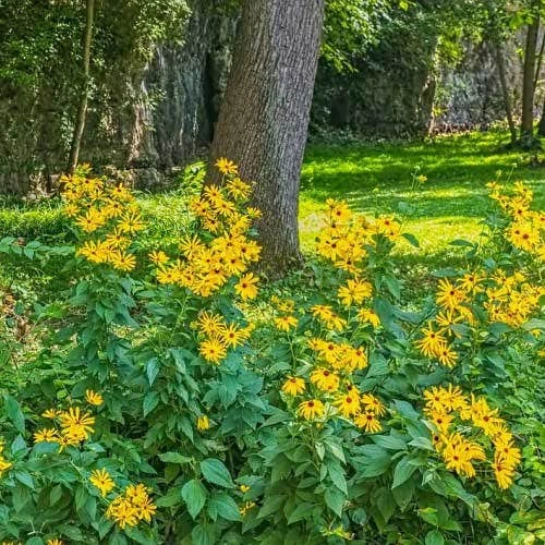 DESCRIPTION: Bushy perennial with golden daisy flowers with a dark centre, flowering over a long late season. Flowers loved by beneficial pollinators, seedheads loved by birds. Makes a good cut flower for the home, and an attractive addition to a cottage style or naturalistic garden. RHS Award of Garden Merit.